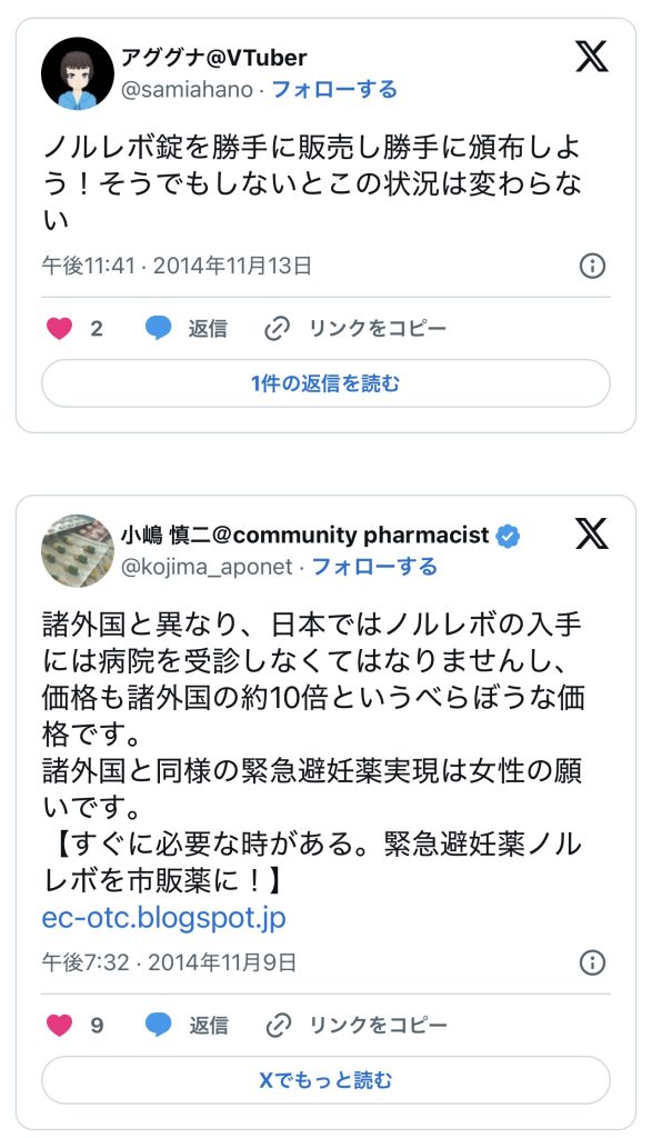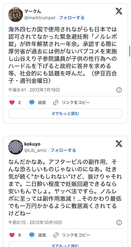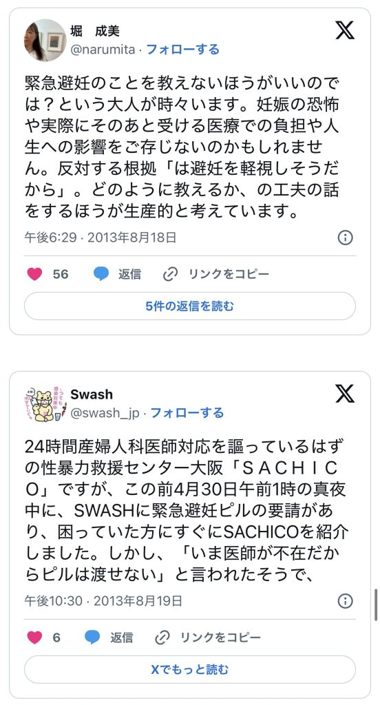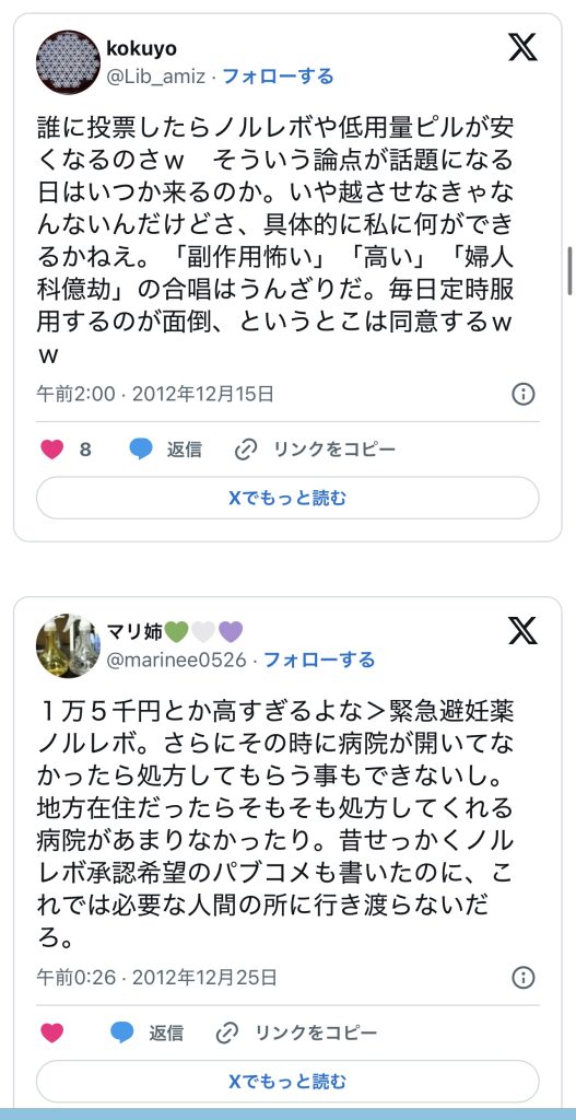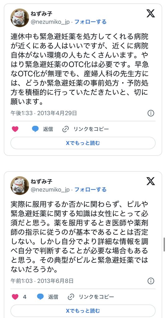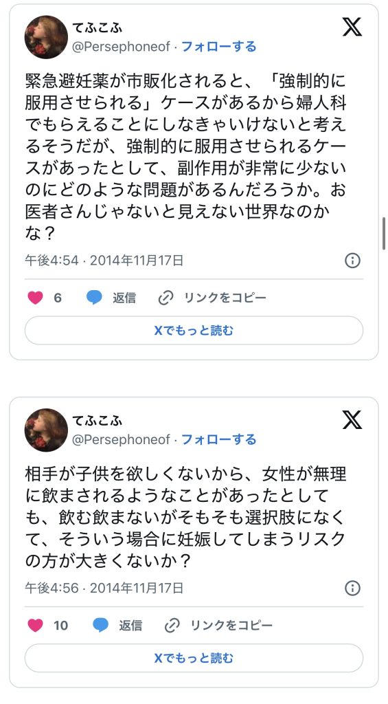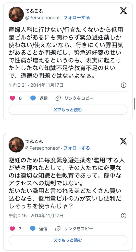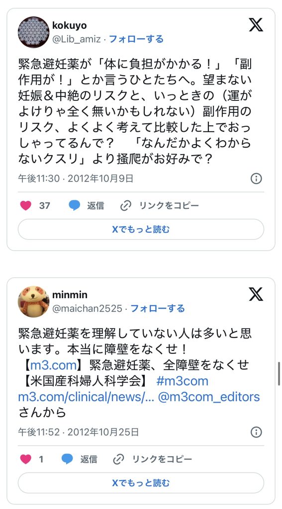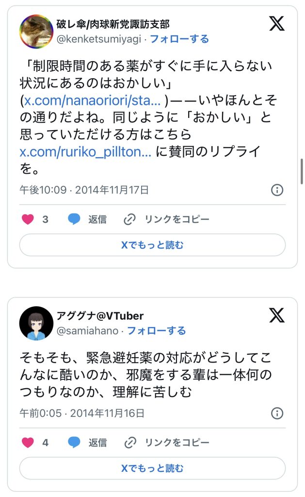 このエントリーは、2010〜2014年頃のツイートを掘り起こして一気に並べ、「ノルレボOTC化」をめぐる“声の地層”そのものを見せている。強姦被害・日曜の救急外来・地方や留学生の孤立・親に言えない未成年など、多様な具体例が並ぶことで、「乱用防止」よりもはるかに切実なアクセス権と安全確保の論点が浮かび上がる。同時に、当時のTwitterがまだ多様な当事者・専門職・市民が議論し合える公共圏として機能していた、その空気感自体が貴重な史料になっている。