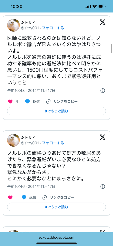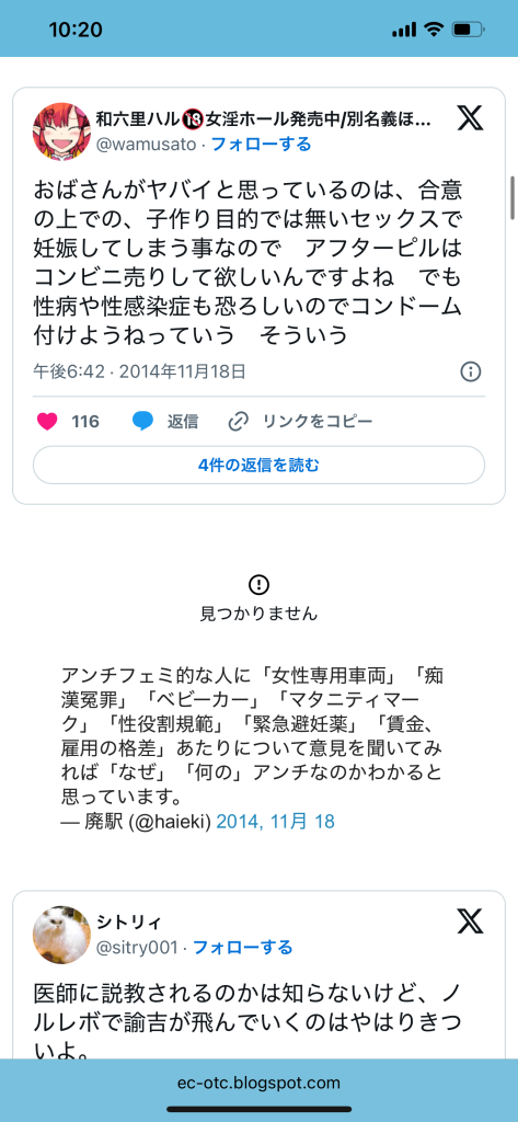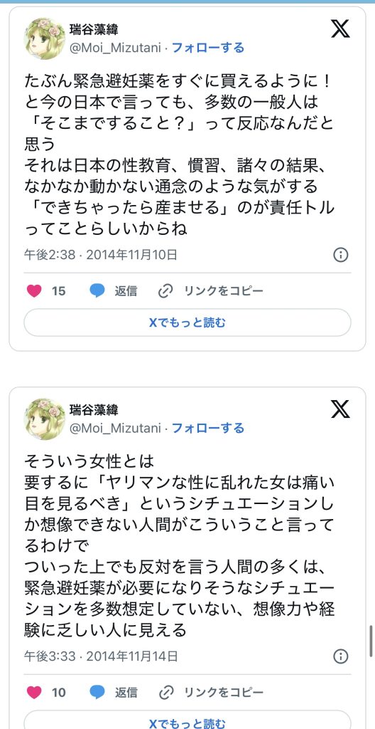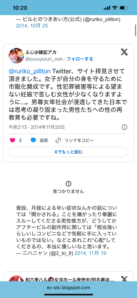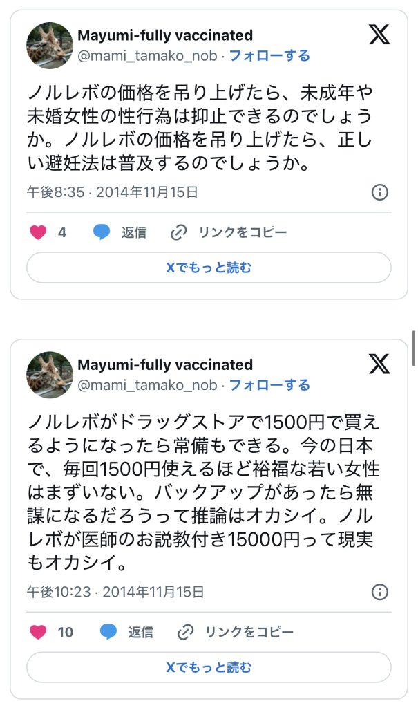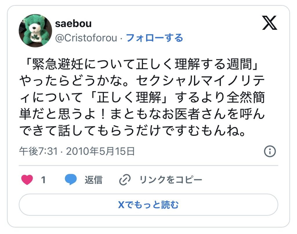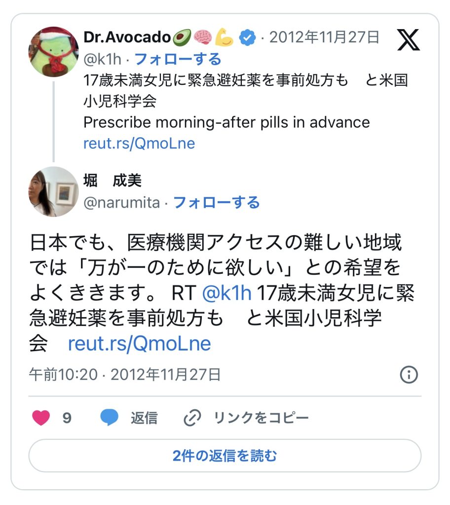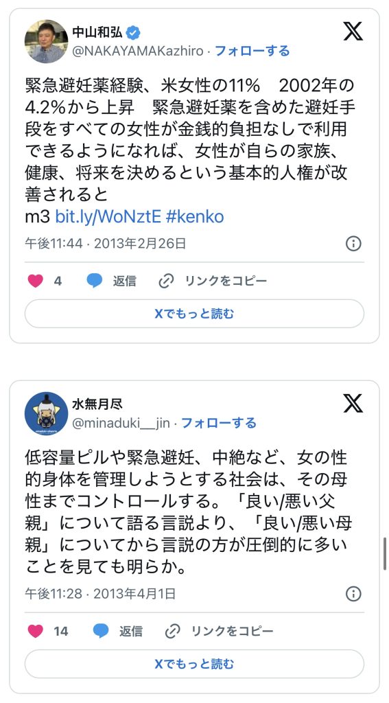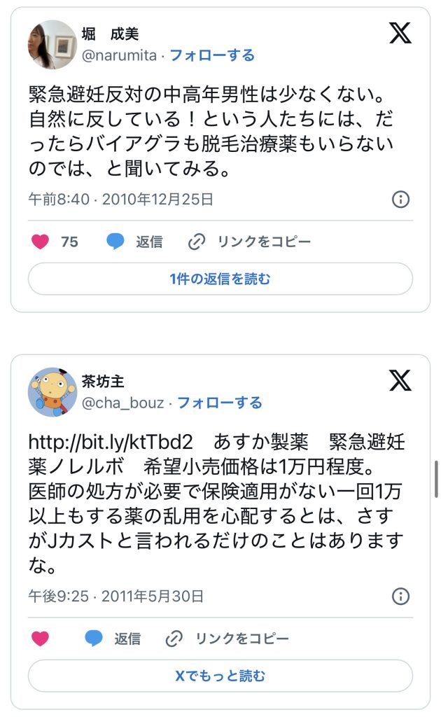 このエントリーは、2010〜2014年頃のツイートを掘り起こして一気に並べ、「ノルレボOTC化」をめぐる“声の地層”そのものを見せている。強姦被害・日曜の救急外来・地方や留学生の孤立・親に言えない未成年など、多様な具体例が並ぶことで、「乱用防止」よりもはるかに切実なアクセス権と安全確保の論点が浮かび上がる。同時に、当時のTwitterがまだ多様な当事者・専門職・市民が議論し合える公共圏として機能していた、その空気感自体が貴重な史料になっている。