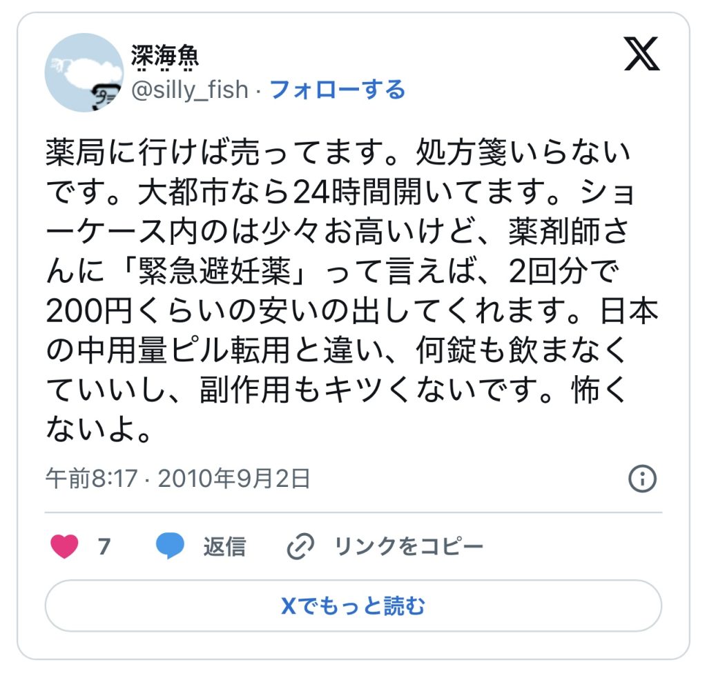 えーっと、私国際生の駆け込み寺になってるのは毎度のことなんだけど、今回は緊急避妊ピル(アフターピル)について問い合わせがあって、明日日曜で病院空いてないからどこで手に入れることできるんだろう?どこに相談すればいいのかも分からない。。学校も閉まってるし。。