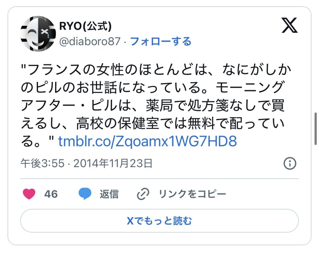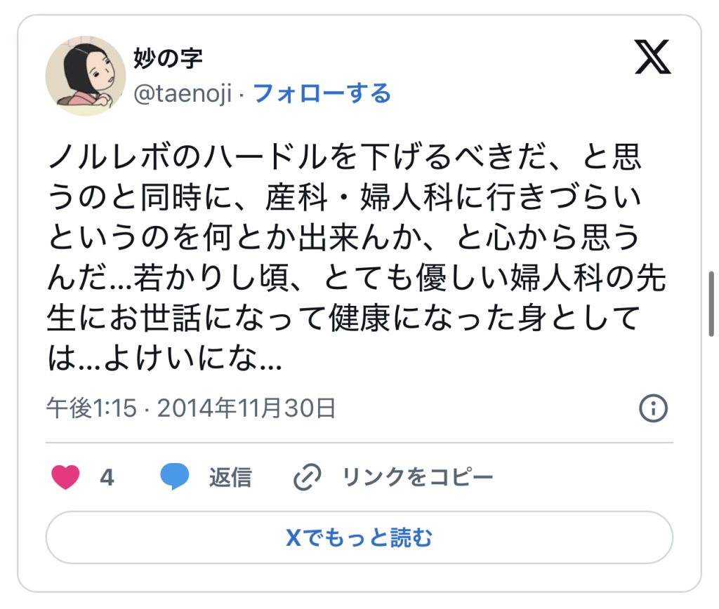 ③とりあえず言いたいことはノルレボが市販薬云々をきっかけに、もっと女性が自分の身体に対して関心を持つようになればいいなあってことです。女性は守られながら自立する環境が整っているわけだしね。