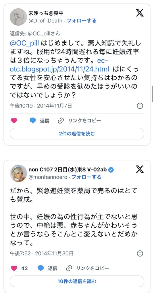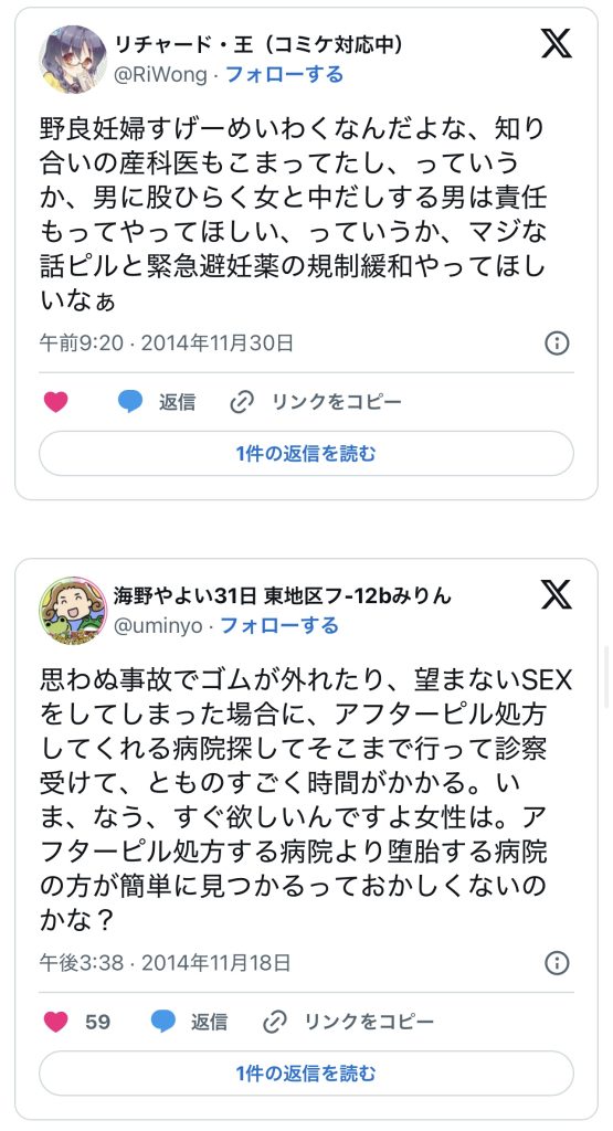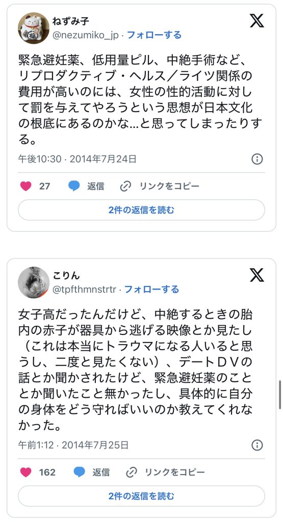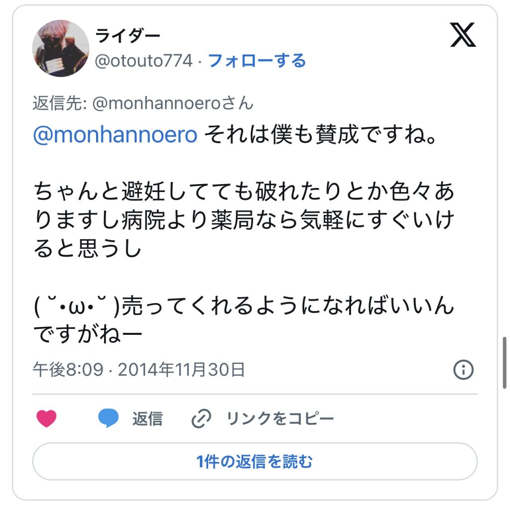 “@monhannoero: だから、緊急避妊薬を薬局で売るのはとても賛成。 世の中、妊娠の為の性行為が主でないと思うので、中絶は悪、赤ちゃんがかわいそうとか言うならそこんとこ変えないとだめかなって。” 避妊の責任を女子側に全部押し付けるのがおかしい、そもそも男がゴムせんとな。