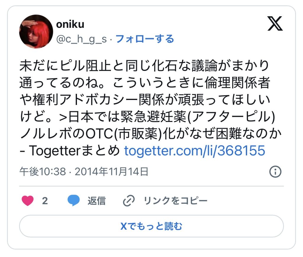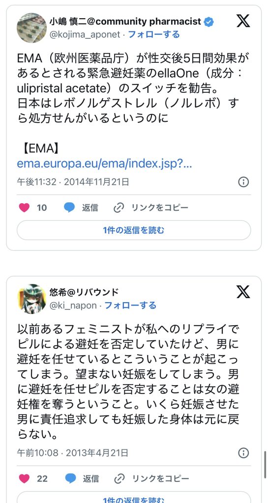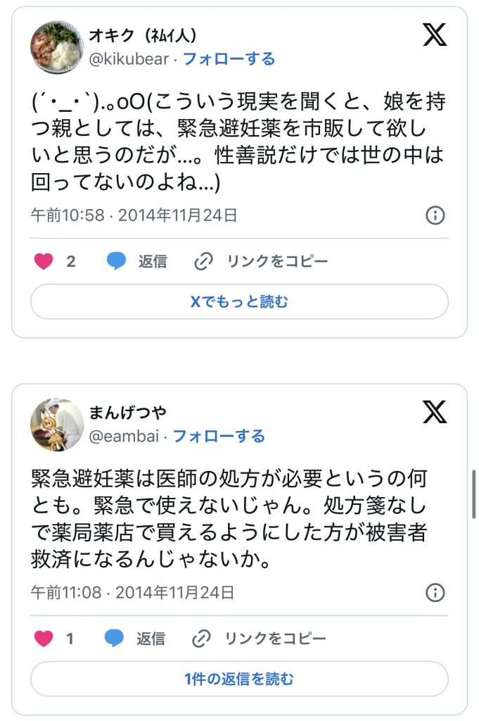 ①緊急避妊薬のノルレボを市販薬にしよう!っていう活動があるらしく、想像以上に賛否両論で吃驚した。そもそも緊急避妊薬を必要とする女性は多いのに、緊急避妊薬の認知度が日本はまだ低いし、女性が低用量ピルを服用していることに対し治療目的より先に避妊目的だと思われることも多いよね。