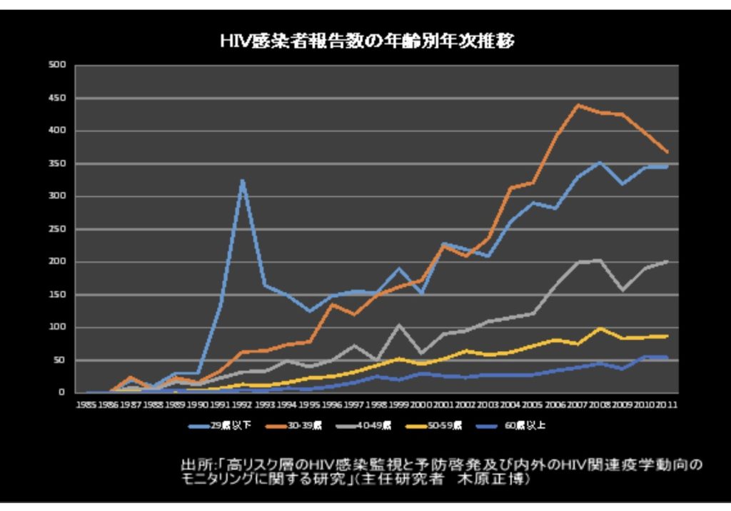 上の図に見るように、日本のHIV感染者の多くは30歳台以下です。