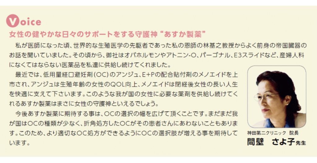 なお、同上冊子では、オーキッドクラブの「理事長」真壁さよ子医師は、あすか製薬を「守護神」と褒めちぎっています。
