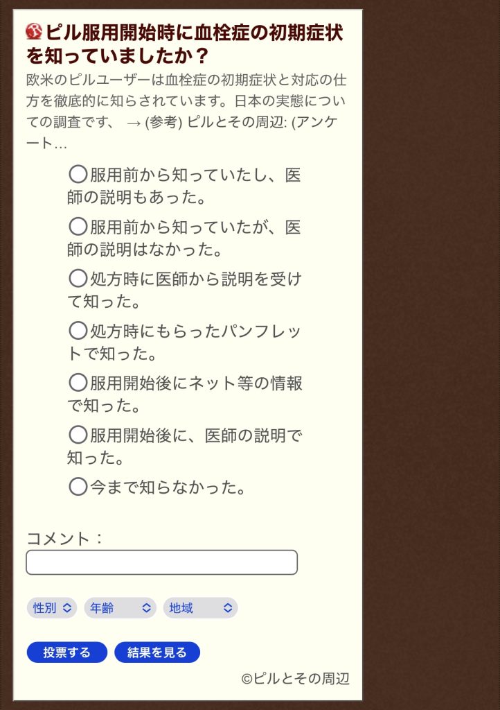 欧米のピルユーザーは血栓症の初期症状と対応の仕方を徹底的に知らされています。日本の実態についての調査です、 → (参考) ピルとその周辺: (アンケート…