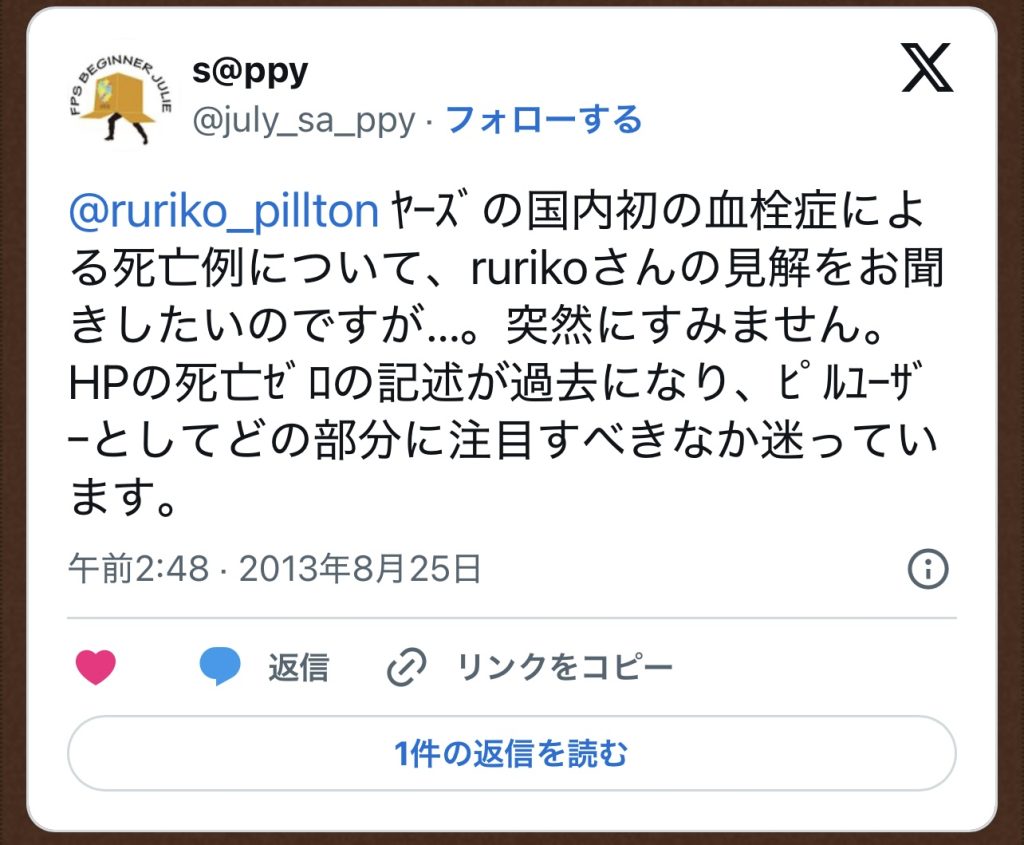 (このヤーズ血栓症死亡例の記事と一連の血栓症シリーズは、当時ピルを服用していた私たちにとって、ほぼ唯一「具体的にどう気をつければ自分の身を守れるのか」を教えてくれる情報源だった。単に「怖いか怖くないか」ではなく、「どんな初期症状を見逃してはいけないのか」「どの診療科に駆け込むべきか」まで言語化してくれたのはrurikoさんだけだったと思う。低用量ピルユーザーは、このようなテキストに実際に命を支えられながらサバイバルしていた時代を生きていた。)
