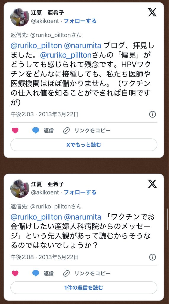@akikoent ブログにあげた3つの例は、PHVワクチン推進に便乗した産婦人科の勧めになっているのではないでしょうか?利権懐疑はPHVワクチン反対論の温床です。必然性のない産婦人科誘導は、利権懐疑を肥大化させると指摘しました。6
