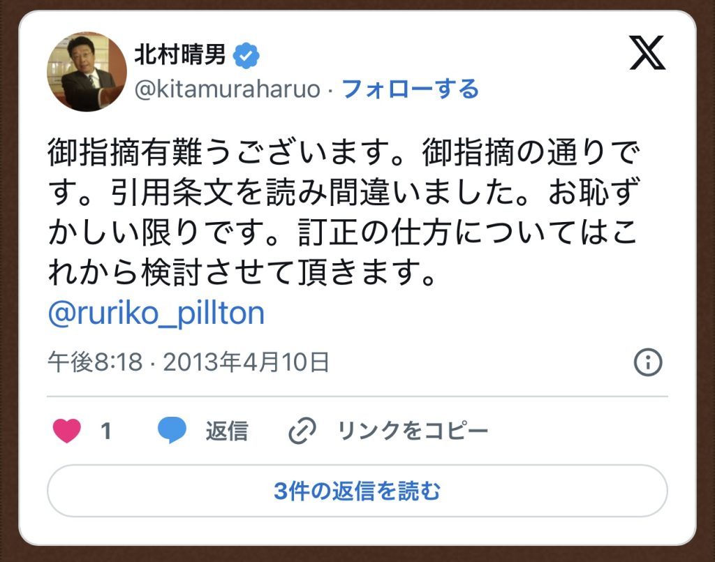 @kitamuraharuo 生意気なツイートにご丁寧なご返信、感謝です。真摯なご対応に心から敬意を表します。ブロクでは挑発的で失礼な言辞が使われています。この点お詫び致します。訂正なり削除すべきなのですが、もしお許しいただけるなら、私も含めて他山の石とするため残させて下さい。