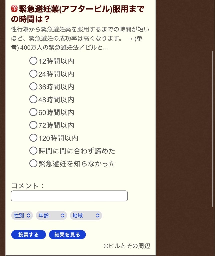 (原文どおり全文写本。このエントリは、400万人規模のデータへのリンクを添えつつ、「何時間後に飲めたか」を細かく刻んだ選択肢を提示していて、実際のアクセス遅延の分布を可視化するための設計そのものが重要だと思い、アーカイブに残している。緊急避妊を「知っていたか/知らなかったか」を同列に置いている点も、日本の性教育・情報格差の実態を測る装置として機能している。)