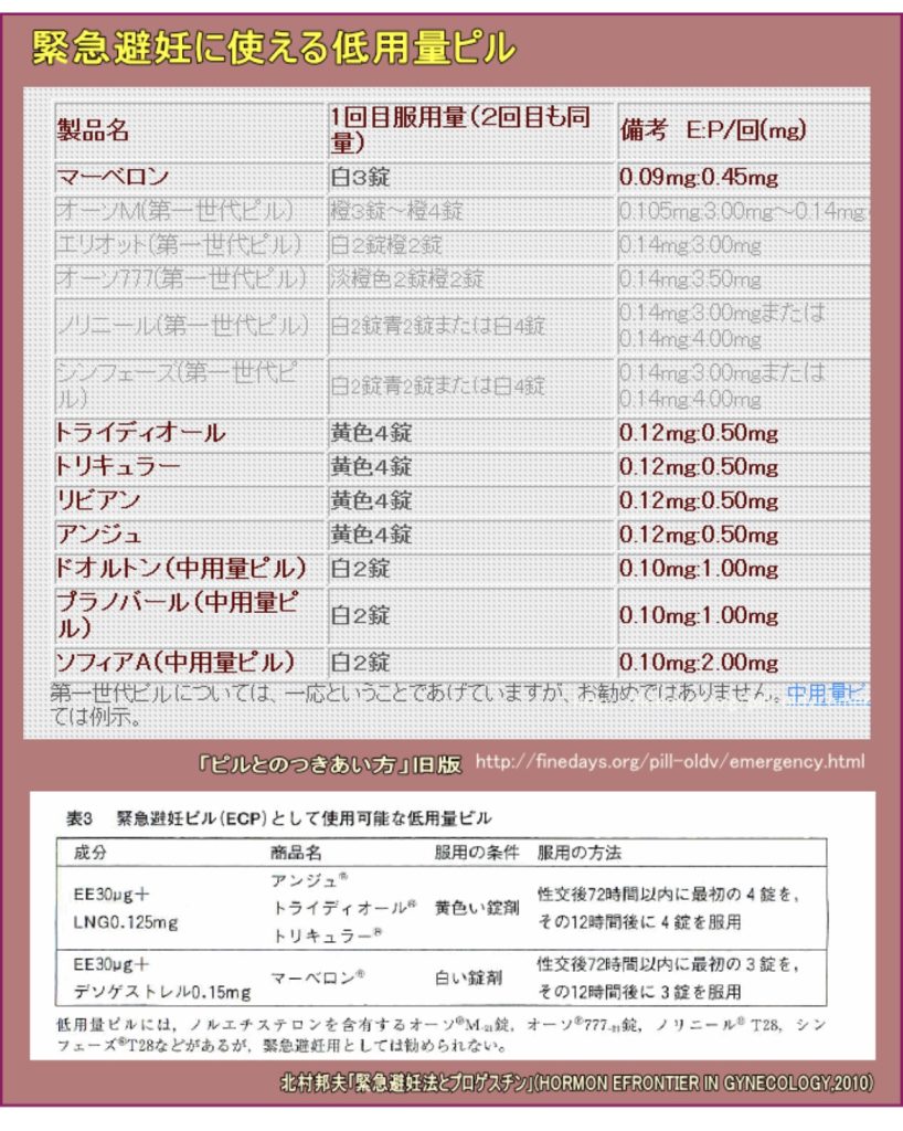 「緊急避妊法とプロゲスチン」(HORMON EFRONTIER lN GYNECOLOGY, VOL.17. No.2.,2010.6)でも低用量ピルと中用量ピルが表になっています。