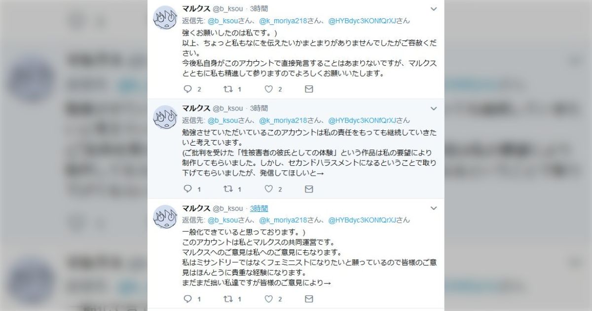 【2018.04.30】男性フェミニストのマルクスさんの「性被害者の彼氏としての体験」漫画&アカウントが彼女と共同運営で炎上した件(随時更新)