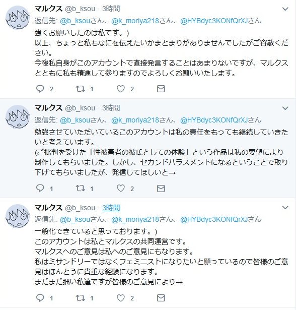 @HYBdyc3KONfQrXJ あなたの考えに賛同します。 僕はフェミニストを自称することはやめました。 ミソジニーを内包する男性としてそれでもミソジニー社会の問題点を漫画にし、慎重になり、ゾーニングをします。 あなたとの議論で大変勉強になりました。