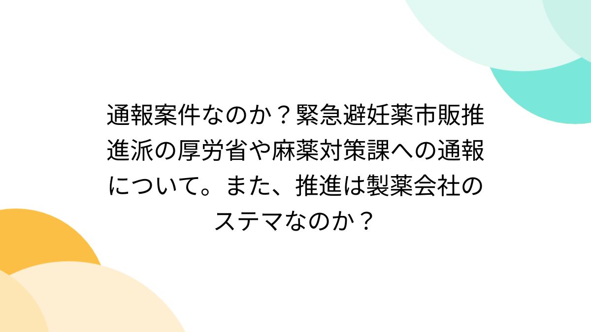 通報案件なのか?緊急避妊薬市販推進派の厚労省や麻薬対策課への通報について。また、推進は製薬会社のステマなのか?