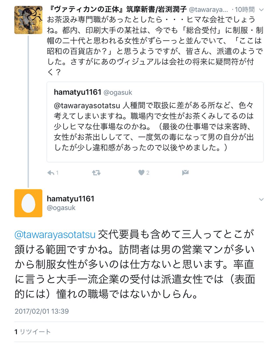 お茶汲みの話もこの受付の話も、つまり「男をもてなすのが(若い)女の役目」ということだよね。派遣の女性にとっては憧れの職場って…そもそも若いうちだけいてほしいから非正規雇用っていう差別があることは無視か。びっくりするほど見えてないんだな、女性差別が。 pic.twitter.com/MfO65FxncG