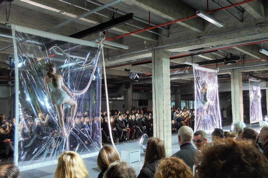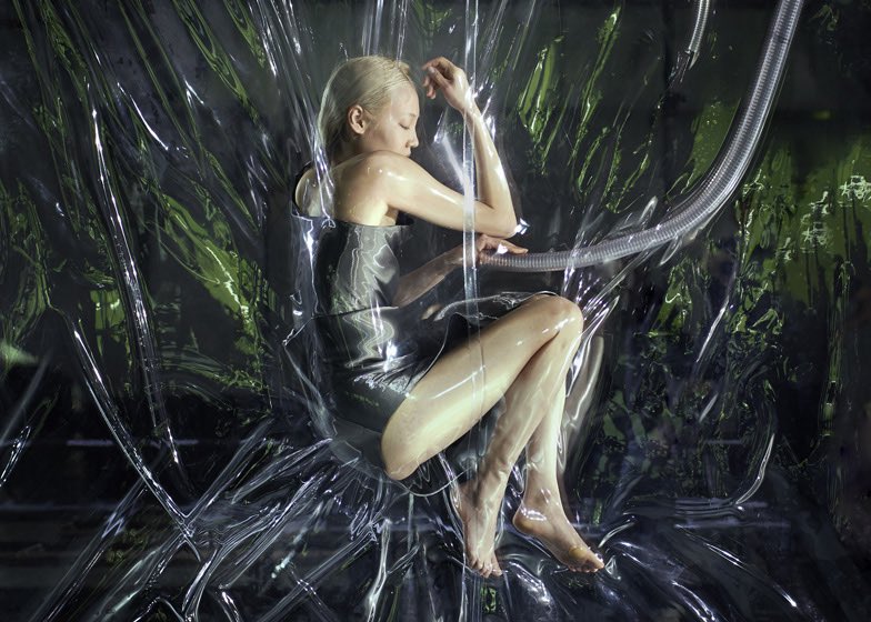 リンク Dezeen Vacuum-packed models installed at Iris van Herpen’s fashion show Models were suspended in plastic vacuums during Dutch fashion designer Iris van Herpen’s Autumn Wi..