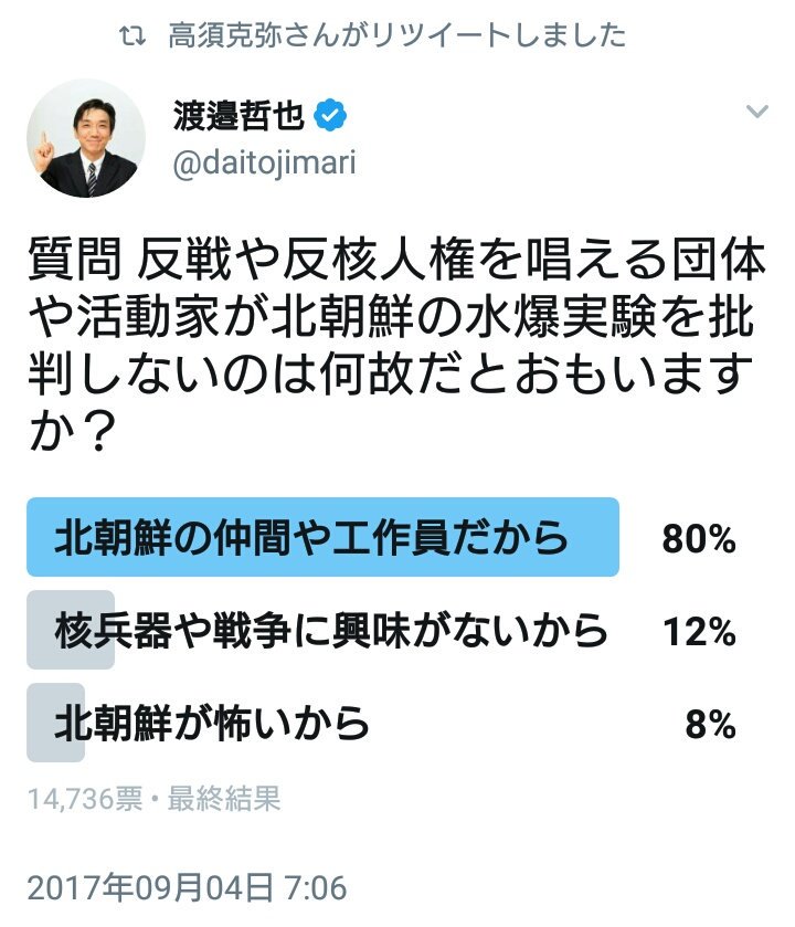 lkj777http://jklsite2.tumblr.com/post/165075651987/20170907rec どっちもどっちでうんざりとかいう意見もありますが、まあ一番うんざりしているのは当方でして、核ミサイルの時に何が真空パックやねんとしか思えないですね。それにね、今回はいつもと違うよ。今までと同じじゃない。ついにLGBTQが動き出した。今まで一度も見たことがないアカウントが動き出した。これは確実です。過去のまとめと比較してみるとわかるでしょう。