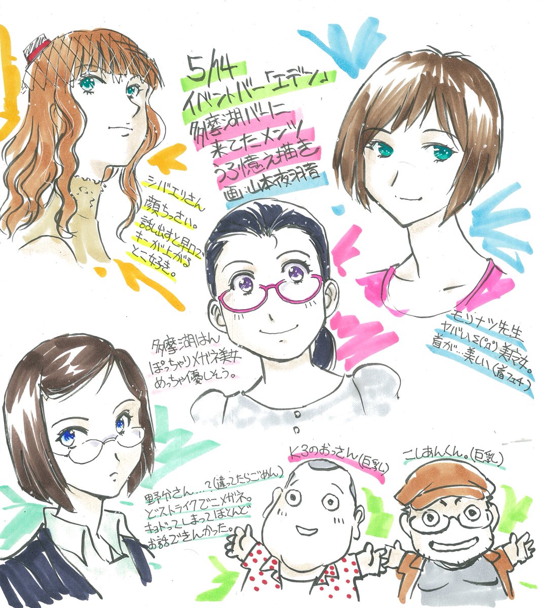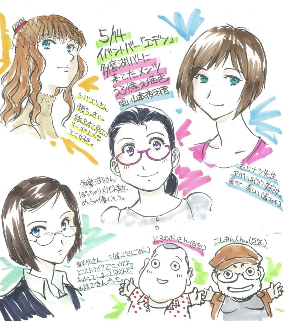 うお、おいらもいれていただいてありがとうございます……。巨乳枠…… / “山本夜羽音@2018メガ秘書新作進捗中さんのツイート: “5月14日の #多摩湖バー に来てた方をうろ覚えで描いてみました。ご査収下さい。… “” htn.to/FckbCUFg